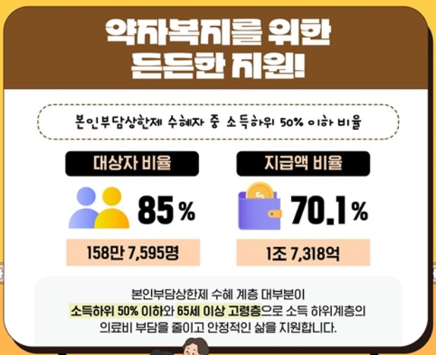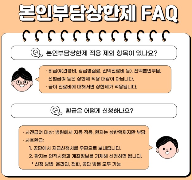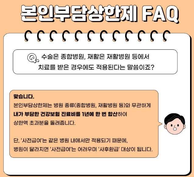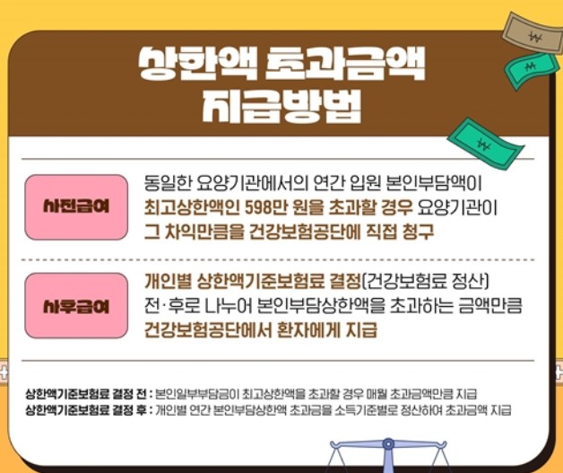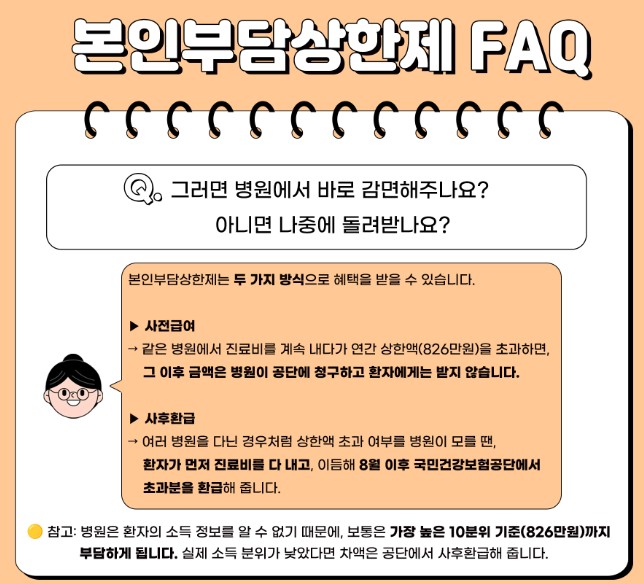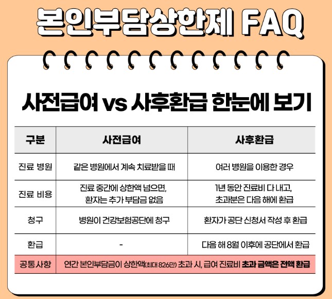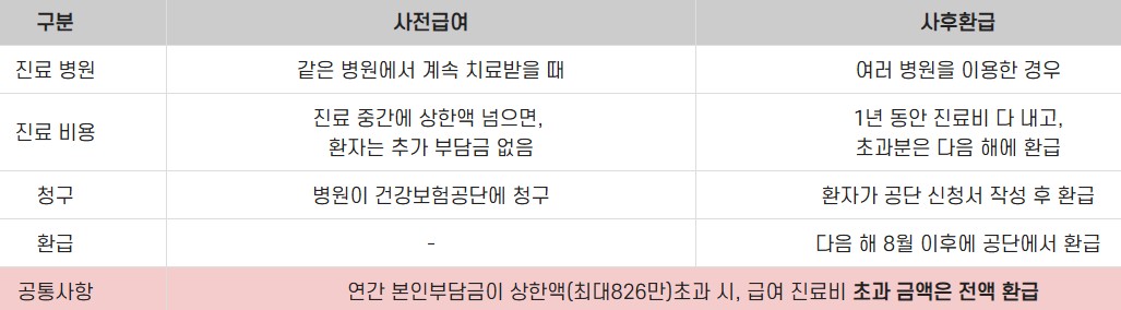 - 사전급여 : 동일 요양기관에서 진료를 받는 도중 본인일부부담금이 최고상한액(2025년 기준 826만원)을 초과하면, 환자는 최고상한액까지만 부담하고 나머지는 요양기관이 공단에 청구합니다.