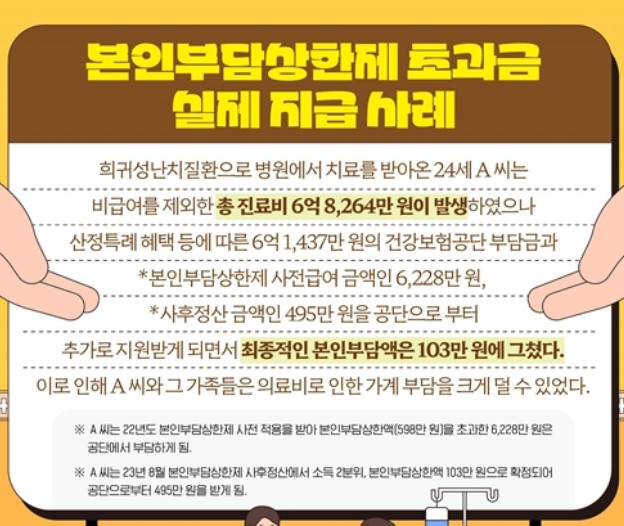 - 사후환급 : 사전급여를 제외한 연간 총 본인일부부담금이 개인별 상한액을 넘을 경우, 공단이 환자에게 직접 초과액을 지급합니다.