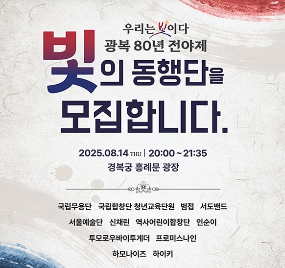 오는 8월 14일 저녁 8시, 경복궁 흥례문에서 광복 80년 전야제가 국민과 함께 진행됩니다. 이번 행사는 “우리는 빛이다”를 주제로 케이팝·전통예술·뮤지컬을 아우르는 풍성한 문화예술 축제가 펼쳐질 예정입니다.