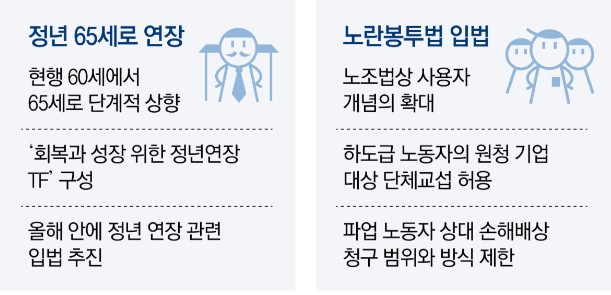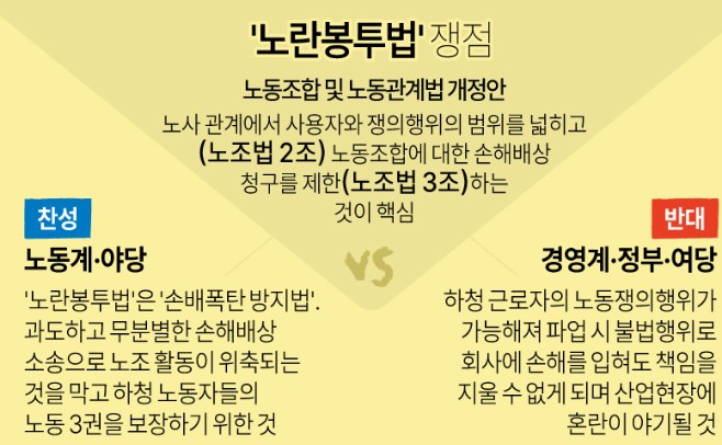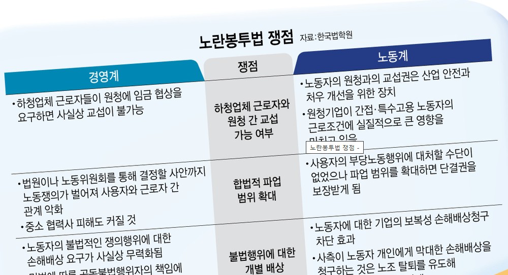 | 간접고용 노동자 권리 강화 | 불법 점거 등 위법행위 면책 우려 |