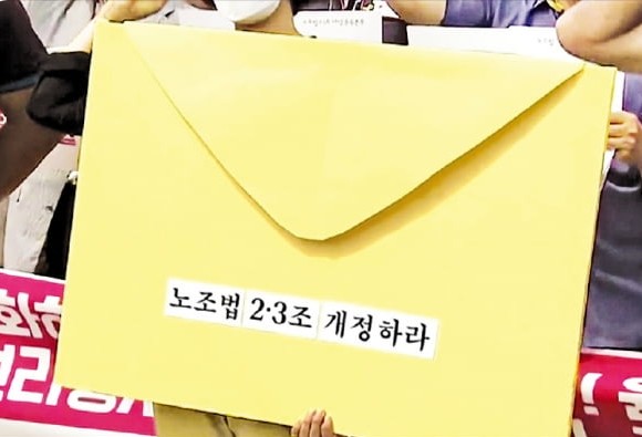 노란봉투법은 노동조합 및 노동관계조정법(노조법) 제2조와 제3조 개정안을 통칭하는 말입니다. 2014년 쌍용자동차 파업 당시 대규모 손해배상 청구에 시달리던 노동자들을 돕기 위해 시민이 노란봉투에 성금을 넣어 보낸 것이 계기가 되어 이 법의 상징이 되었습니다.