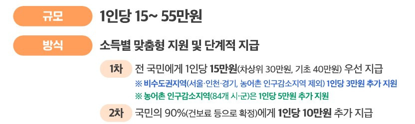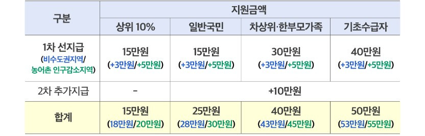 - A. 기본 1인당 10만 원이며, 소득 수준, 지역 조건에 따라 추가 지원이 있어 최대 15만 원까지 가능합니다.