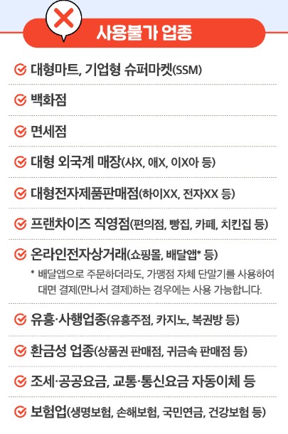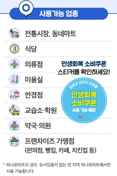 - A. 전통시장, 지역마트, 음식점, 학원, 병원 등 지정 업종에서 사용 가능합니다. 사용처는 지역별로 상이하니 쿠폰 수령 후 문자로 안내됩니다.