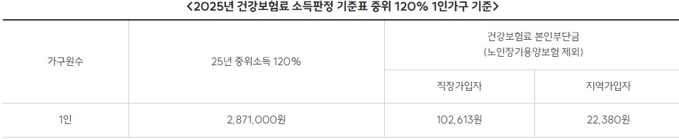 - 소득: 기준 중위소득 120% 이하 (월 2,871,000원, 직장가입자 102,613원·지역가입자 22,380원 건강보험료 기준)