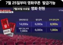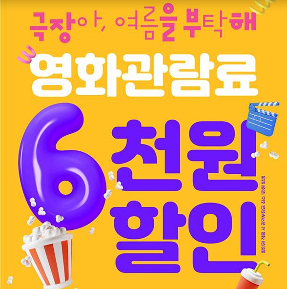 문화체육관광부는 영화진흥위원회와 함께 오는 25일 오전 10시부터 영화관 입장권 6000원 할인권 총 450만 장을 배포한다고 23일 밝혔다. 이번 사업은 내수 진작을 통한 민생 회복과 영화산업 활성화를 위해 확보한 올해 2차 추가경정예산 271억 원으로 추진하는 사업이다. 특히 매월 마지막 수요일 7000원에 관람할 수 있는 '문화가 있는 날'에는 할인권을 사용하면 1000원으로 영화를 즐길 수 있다.