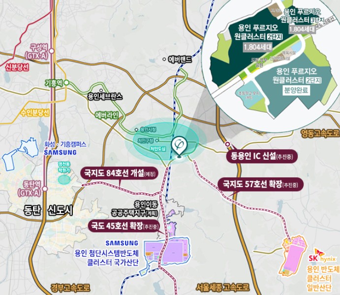 용인 푸르지오 원클러스터 2·3단지는 경기도 용인시 처인구에 위치하며, 두 개의 대규모 반도체 클러스터와 인접해 있습니다.