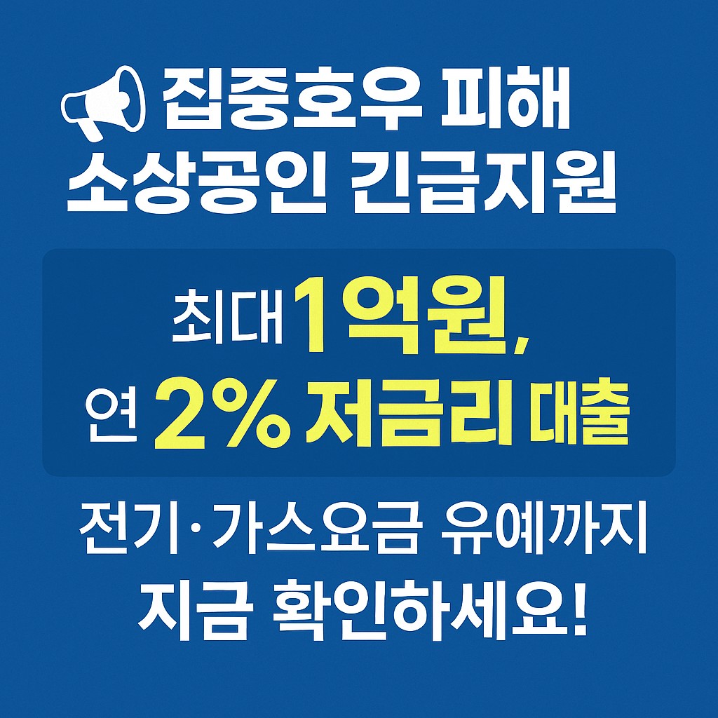 최근 계속되는 집중호우로 피해를 입은 소상공인을 위해 정부가 긴급 금융 및 공공요금 지원책을 내놓았습니다. 최대 1억원 규모의 대출과 연 2% 수준의 저금리, 그리고 전기·가스요금 납부 유예 등 실질적인 지원 방안이 포함되어 있습니다. 이번 포스팅에서는 지원 대상, 내용, 신청 방법까지 자세히 안내드립니다.