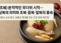 이러한 삼복은 중국 진나라 시절부터 제례와 건강관리 풍습으로 전해졌고, 우리나라 농경사회에서도 건강과 풍요를 기원하는 전통문화로 자리잡았습니다.