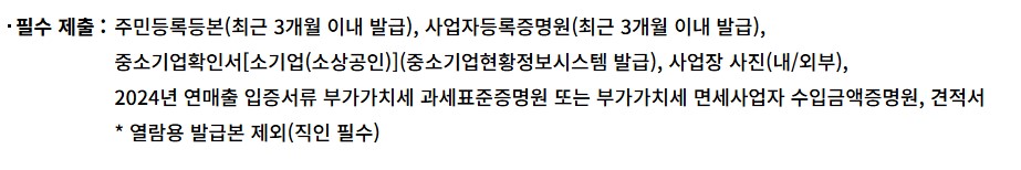 - 필수 제출 서류: 주민등록등본(최근 3개월), 사업자등록증, 중소기업확인서, 사업장 내·외부 사진, 2024년 매출 증빙(부가가치세 증명원), 견적서 등