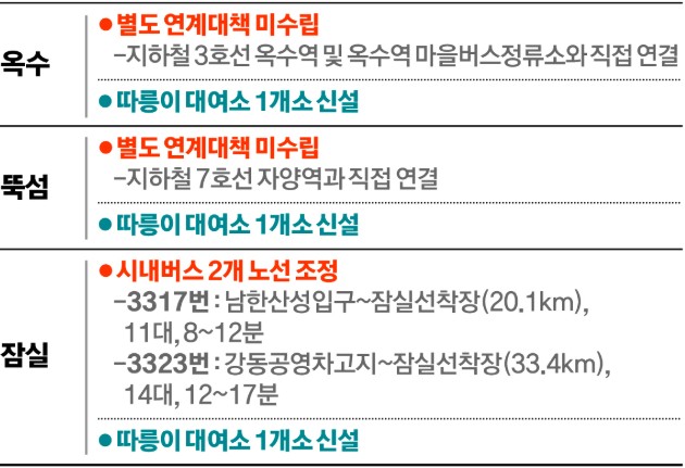 - 잠실: 잠실새내나들목~잠실새내역~종합운동장역~엘스아파트, 15분 간격