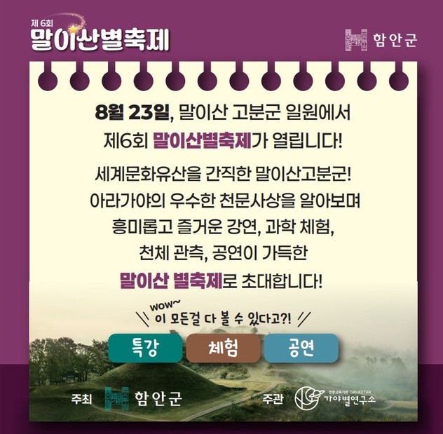 경남 함안 말이산은 가야 고분군이 자리한 역사문화의 중심지이자, 별빛과 함께하는 대표적인 지역 축제의 무대입니다. 매년 가을 열리는 말이산 별축제는 전통과 현대가 어우러진 문화예술 공연과 함께 가족 단위 방문객들에게 큰 인기를 끌고 있습니다.