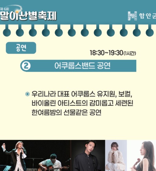 - 별빛 콘서트: 인기 가수와 지역 예술단체의 음악 공연