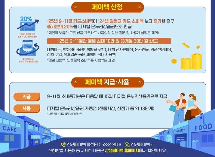 정부가 민생회복 지원사업의 하나로 ‘상생페이백’ 제도를 시행합니다. 올해 9월~11월 동안 지난해보다 카드 소비가 늘어난 국민에게 최대 30만 원의 디지털 온누리상품권을 지급하며, 동시에 상생소비복권 이벤트도 함께 진행됩니다.