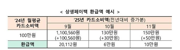 상생페이백은 지난해 월평균 카드소비액보다 올해 9월~11월 카드소비액이 증가한 경우, 증가분의 20%를 환급해주는 제도입니다. 월 최대 10만 원, 3개월간 총 30만 원까지 지급됩니다.