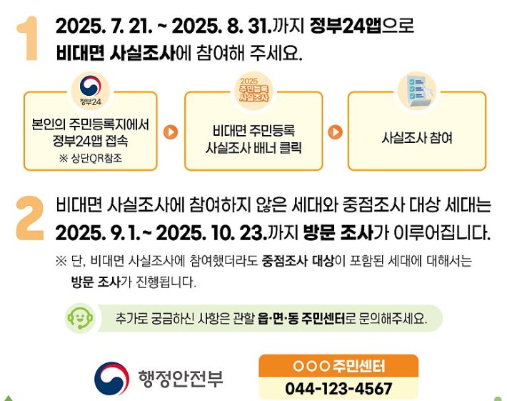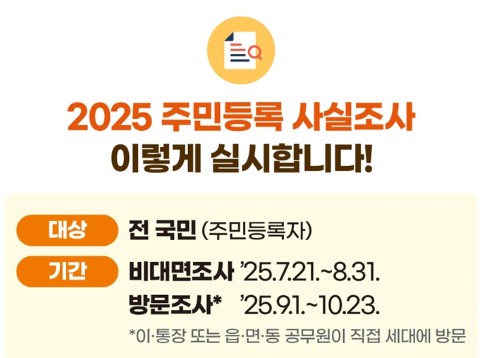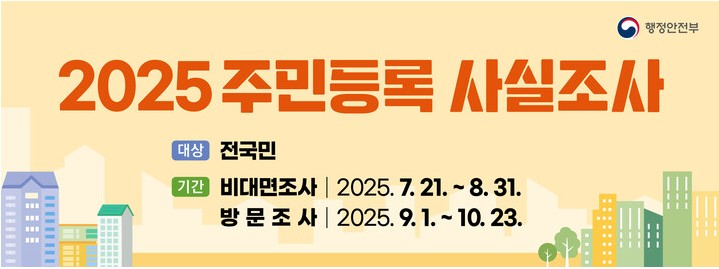 2025년 7월 21일부터 10월 23일까지, 행정안전부는 전국 주민을 대상으로 주민등록 사실조사를 실시합니다. 이번 조사에서는 모바일 비대면 참여 방식이 도입되어, 본인 명의 휴대전화 인증만으로 1분 만에 참여가 가능합니다. 이번 글에서는 조사 목적부터 참여 방법, 이벤트, FAQ까지 한눈에 정리했습니다.