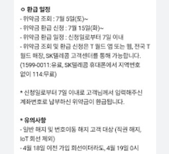 - T월드 앱/웹 접속 → 본인 인증 → 위약금 조회 → 환급 계좌 입력